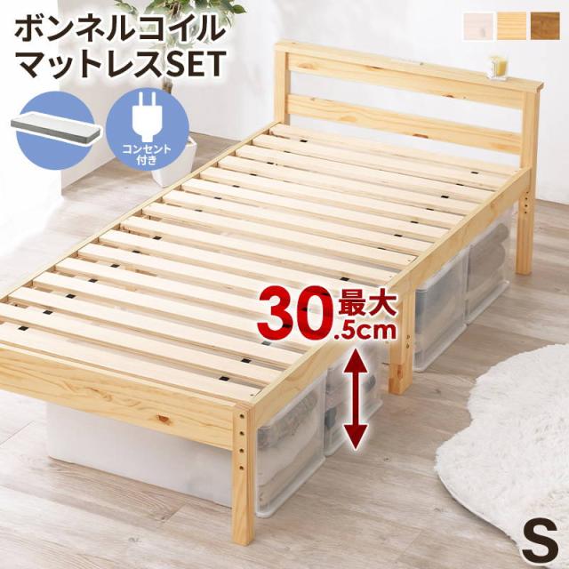 シングルベッド フレーム マットレス付き 木製 すのこ ボンネルコイルマットレスセット 高さ3段階調節