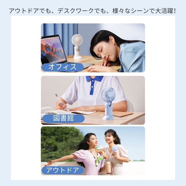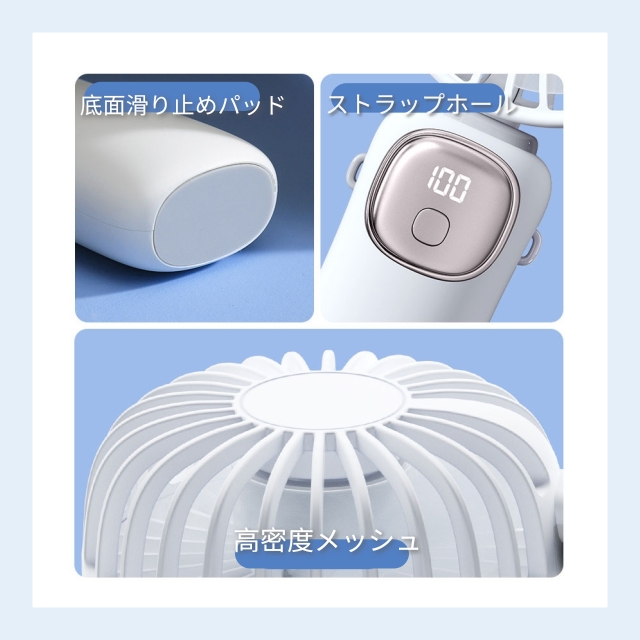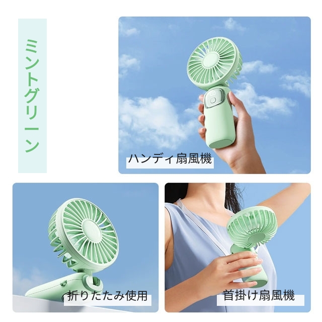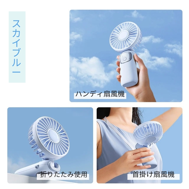 ◆ハンディ扇風機は手持ち、卓上、首掛け、折りたたみの4つの機能を一台に集約しました。ハンドル部分を折りたたむことで、ストラップと組み合わせて首掛け扇風機として使用できます。
