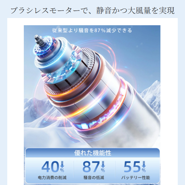 ◆最新のブラシレスDCモーターを採用しており、18dBの静音性を実現しています。従来のモデルと比較して、騒音が80%減少しましたので、静かな環境でも快適に使用できます。