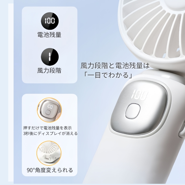 ◆このハンディ扇風機は風量やバッテリー残量をデジタルディスプレイで数字表示し、一目で確認できます。バッテリー残量が少なくなった際もすぐにわかるので、安心です。また、電源を誤ってオンにしないよう、長押しで電源をオンにする仕様となっています。