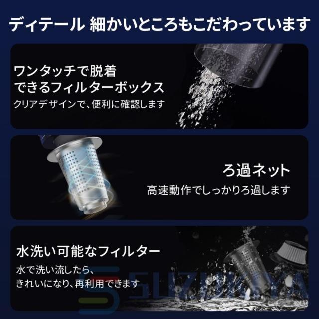 この掃除機は、6000mAhの大容量バッテリーを搭載しており、最大で40分の連続使用が可能です。一度の充電で家全体の掃除が完了するため、充電時間を気にせず使用できます。さらに、低騒音設計により、早朝や深夜でも周囲に迷惑をかけることなく、静かに掃除が行えます。パワフルながら静かな運転音は、日常の騒音ストレスを軽減し、家族や隣人を気にせず快適に使用できるのが魅力です。多重フィルターシステムが微細なホコリやアレルゲンを確実に捉え、清潔な空気を排出します。
