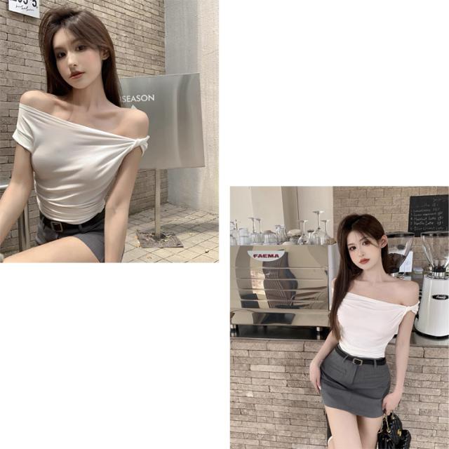 全品送料無料一部除く ツイストワンショルダー スリムトップス ma 【即納】ブロケットコア ブロークコア 淡色 Tシャツ 肩だし ショート丈 ミニ丈 アシメ アシメツイスト ツイストトップス レディース 韓国 Y2Kファッション 韓国ストリート 流行り トレンド かわいい