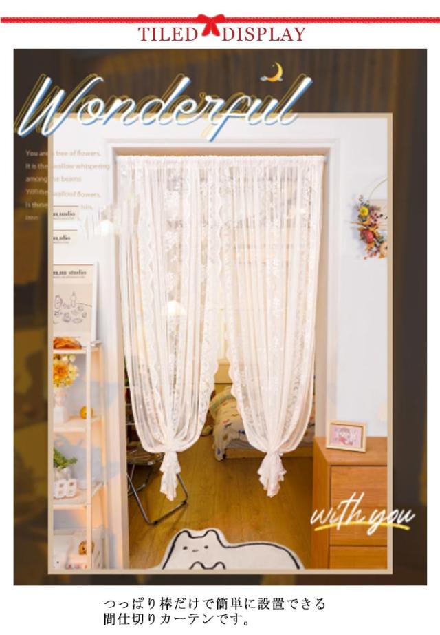 | 突っ張り棒付き!レース生地の間仕切りカーテン。 つっぱり棒だけで簡単に設置できる間仕切りカーテンです。 透け感のあるレースが光と風を取り込みながら、空間をエレガントに装います。 北欧風の花柄が空間をさりげなくオシャレにコーディネイトしてくれます。 ドアのない場所に設置して、のれんとして使ったり、収納スペースや見られたくない場所の目隠しカーテンとして使ったりと、幅広い用途でお使いいただけます。 通気性のあるカーテンで、春夏秋冬、季節を問わずお使いいただけます。 お部屋、キッチンの出入り口に、洗面スペースの間仕切りに。 | |