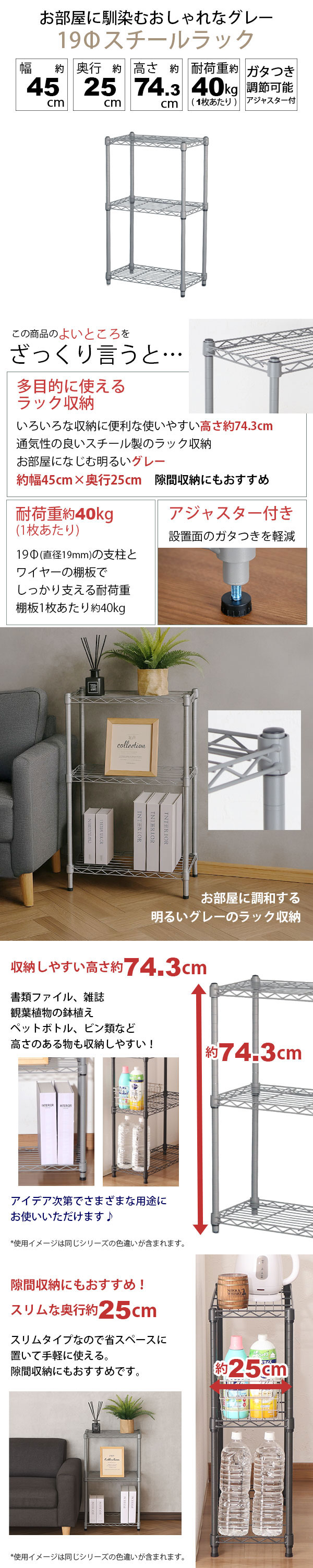 奥行スリム・隙間収納 お部屋に馴染むおしゃれなグレー 19Φスチールラック の説明