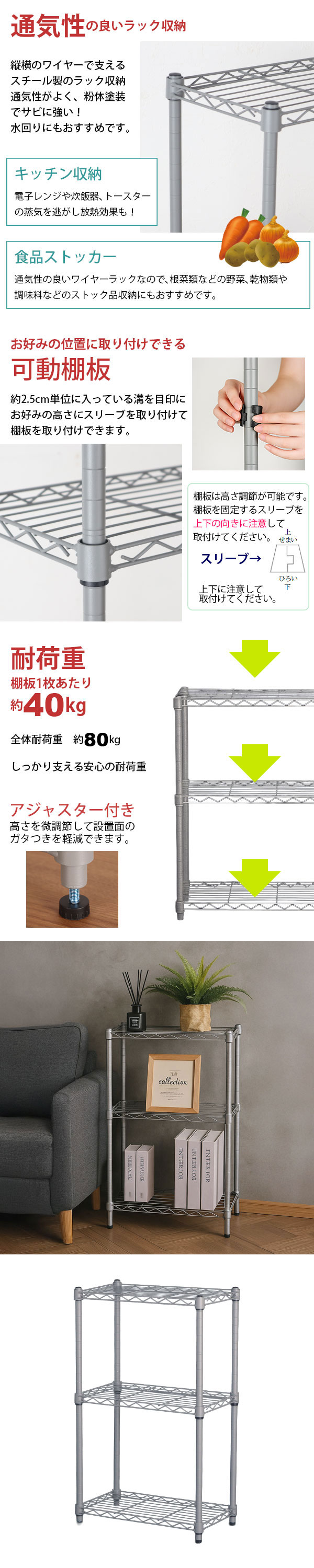 耐荷重(約):棚板垂直静止時40kgまで/枚