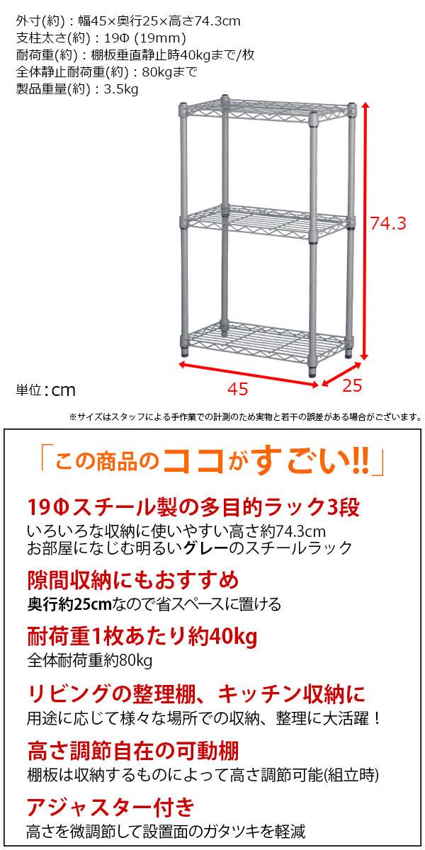 スチールラック 3段 スリム 幅45cm 奥行25cm 高さ74.3cm グレー (約45×25x75cm) アジャスター付き おしゃれ くすみカラー マットシルバー メタル製ラック シェルフ 省スペース キッチンラック 隙間収納 頑丈 スリムラック ベッド横 ソファ横 コンパクト 単品 AAS-4202
