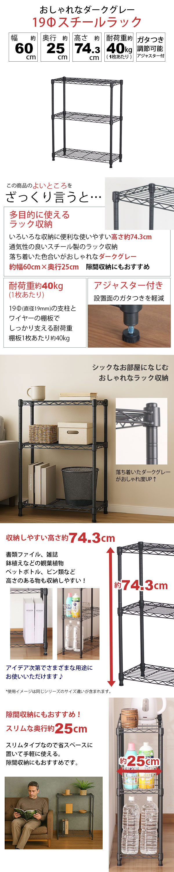 幅約60cm 奥行約25cm 高さ約74.3cm 耐荷重約40kg(1枚あたり) ガタつき調節可能アジャスター付き