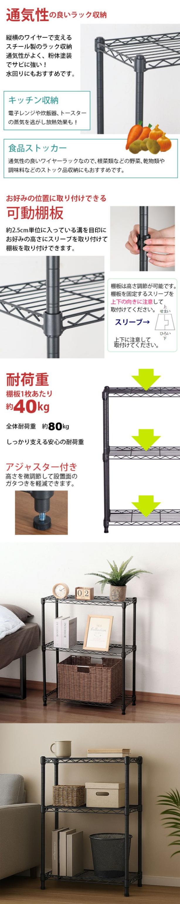 実用性が高い 耐久性 限られたスペースでもしっかり収納 モノトーンインテリア インダストリアルテイスト 汚れが目立ちにくい 落ち着いた空間を演出 自由にレイアウト可能 すき間 キッチンカウンター 棚上 様々な用途に使える ミニラック 子ども部屋 押入れ収納 高い収納力 棚板3枚 簡単に組み立てられる ガタ付き軽減 背板が無い 配線しやすい キッチン家電 収納