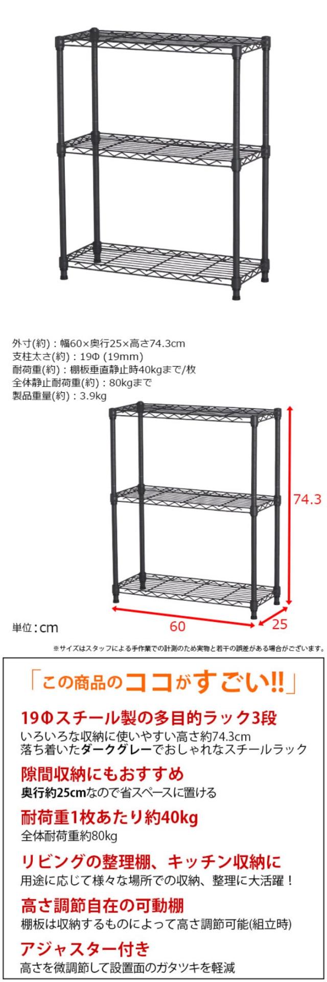 商品名:スチールラック 3段 スリム 幅60cm 奥行25cm 高さ74.3cm ダークグレー (約60×25x75cm) アジャスター付き おしゃれ くすみカラー メタル製ラック シェルフ 省スペース キッチンラック 隙間収納 頑丈 スリムラック ベッドサイドラック ソファ横 コンパクト 単品 AAS-6201 小さい オープンラック 高さを変えられる棚 丈夫 浅型 家具 インテリア 収納家具 棚 ラック 小型 三段ラック 低い 収納棚 低め スチールラック ロータイプ ローラック 高さ調整 マルチラック フリーラック 多目的ラック 整理棚 オープン棚 オープンシェルフ キッチン収納棚 レンジラック 家電収納 調理家電 キッチンストッカー 玄関ラック 玄関収納 ランドリーラック 本棚 ゲーム機 ディスプレイラック 飾り棚 コレクションラック 小物収納 おもちゃ 雑貨 ランドセルラック フラワースタンド 花台 プランターラック ベッドサイド ソファサイド デスク横 デスクサイド シンプル インダストリアル風 新生活 一人暮らし ワンルーム キッチン 台所 リビング ダイニング 玄関 オフィス 店舗 子供部屋 洗面所 脱衣所 クローゼット 押し入れ パントリー 納戸 すっきり 片付け 可動棚 アジャスター付き ポール径19mm 見せる収納 モノトーン