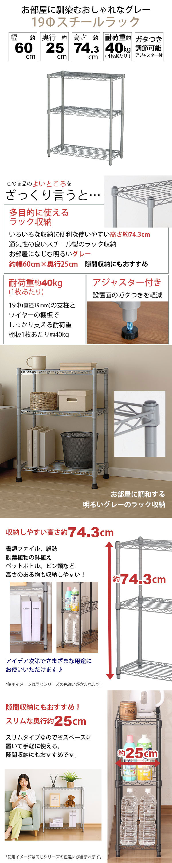 奥行スリム・隙間収納 お部屋に馴染むおしゃれなグレー 19Φスチールラック の説明
