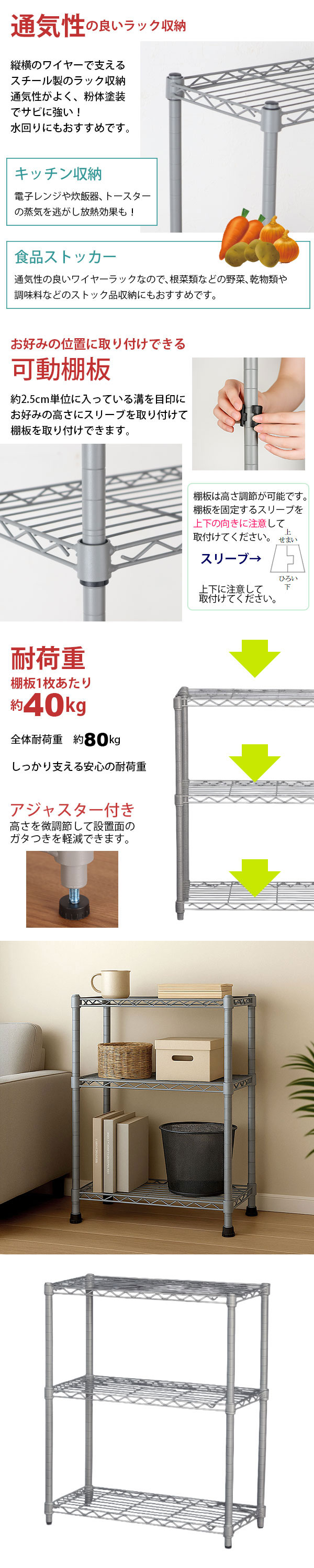19Φ(直径19mm)の支柱とワイヤーの棚板でしっかり支える耐荷重棚板1枚あたり約40kg