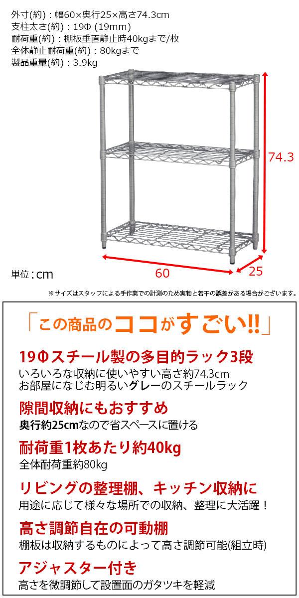スチールラック 3段 スリム 幅60cm 奥行25cm 高さ74.3cm グレー (約60×25x75cm) アジャスター付き おしゃれ くすみカラー マットシルバー メタル製ラック シェルフ 省スペース キッチンラック 隙間収納 頑丈 スリムラック ベッド横 ソファ横 コンパクト 単品 AAS-6202