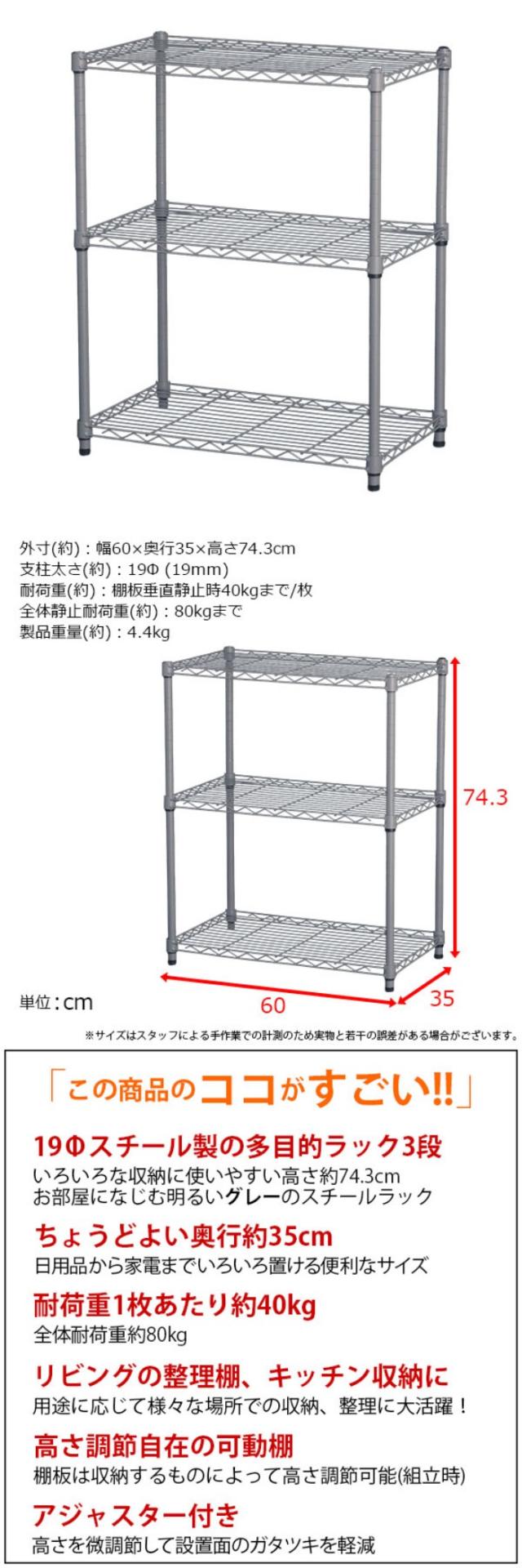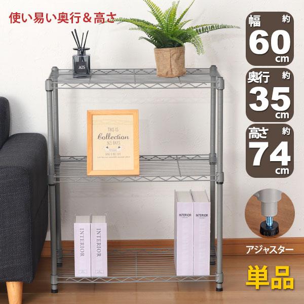 商品名:スチールラック 3段 スリム 幅60cm 奥行35cm 高さ74.3cm グレー (約60×35x75cm) アジャスター付き おしゃれ くすみカラー マットシルバー メタル製ラック シェルフ 省スペース キッチンラック 隙間収納 頑丈 スリムラック ベッド横 ソファ横 コンパクト 単品 AAS-6302 小さい オープンラック 高さを変えられる棚 丈夫 浅型 家具 インテリア 収納家具 棚 ラック 小型 三段ラック 低い 収納棚 低め スチールラック ロータイプ ローラック 高さ調整 マルチラック フリーラック 多目的ラック 整理棚 オープン棚 オープンシェルフ キッチン収納棚 レンジラック 家電収納 調理家電 キッチンストッカー 玄関ラック 玄関収納 ランドリーラック 本棚 ゲーム機 ディスプレイラック 飾り棚 コレクションラック 小物収納 おもちゃ 雑貨 ランドセルラック フラワースタンド 花台 プランターラック ベッドサイド ソファサイド デスク横 デスクサイド シンプル インダストリアル風 新生活 一人暮らし ワンルーム キッチン 台所 リビング ダイニング 玄関 オフィス 店舗 子供部屋 洗面所 脱衣所 クローゼット 押し入れ パントリー 納戸 すっきり 片付け 可動棚 アジャスター付き ポール径19mm 見せる収納 モノトーン