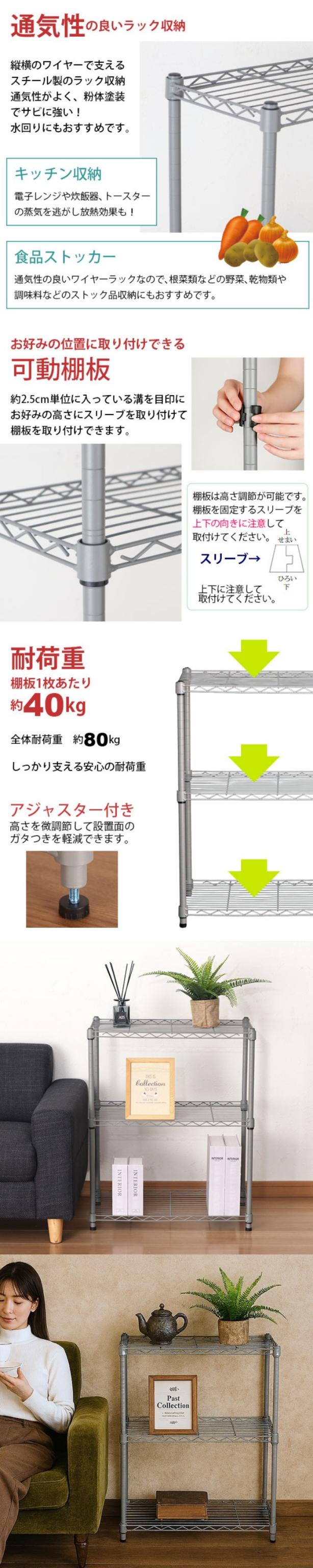 実用性が高い 耐久性 限られたスペースでもしっかり収納 モノトーンインテリア インダストリアルテイスト 汚れが目立ちにくい 落ち着いた空間を演出 自由にレイアウト可能 すき間 キッチンカウンター 棚上 様々な用途に使える ミニラック 子ども部屋 押入れ収納 高い収納力 棚板3枚 簡単に組み立てられる ガタ付き軽減 背板が無い 配線しやすい キッチン家電 収納