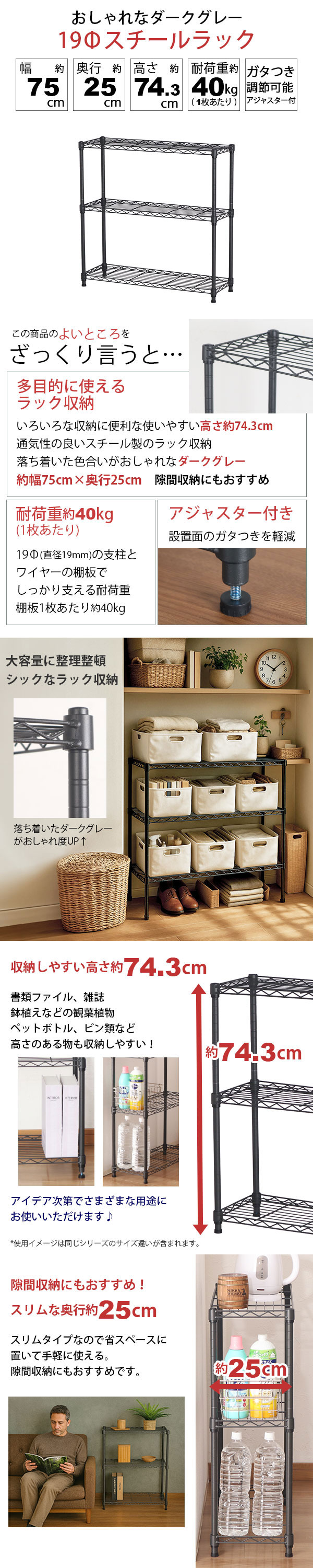 奥行スリム・隙間収納 おしゃれなダークグレー 19Φスチールラック の説明