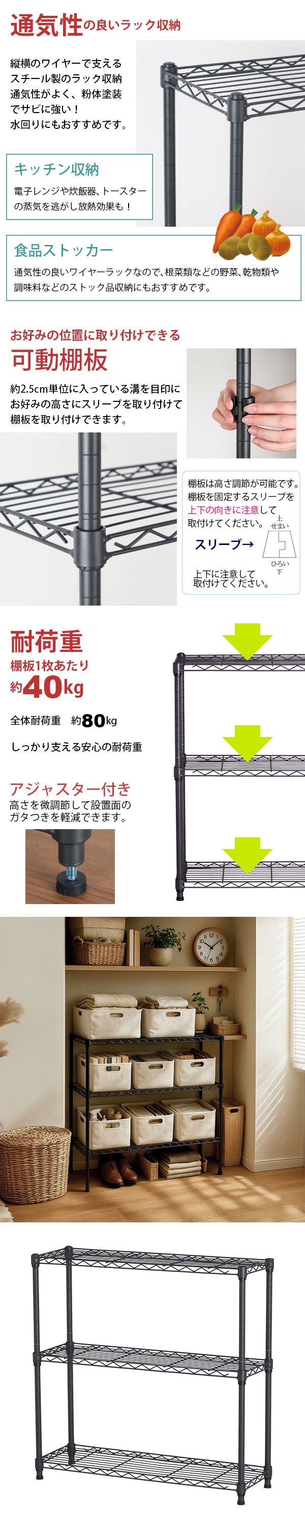 耐荷重(約):棚板垂直静止時40kgまで/枚