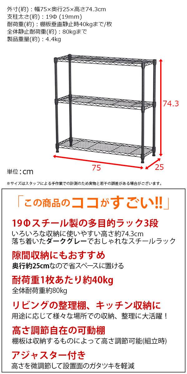 スチールラック 3段 スリム 幅75cm 奥行25cm 高さ74.3cm ダークグレー (約75×25x75cm) アジャスター付き おしゃれ くすみカラー メタル製ラック シェルフ 省スペース キッチンラック 隙間収納 頑丈 スリムラック ベッドサイドラック ソファ横 コンパクト 単品 AAS-7201