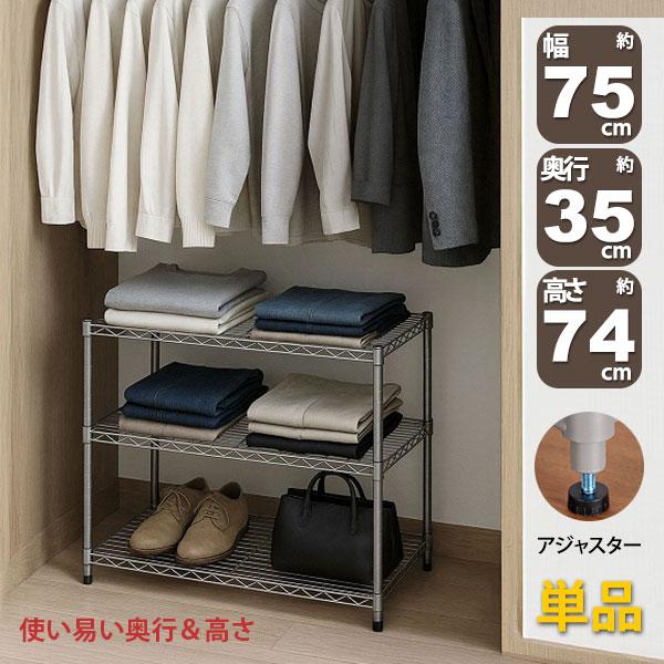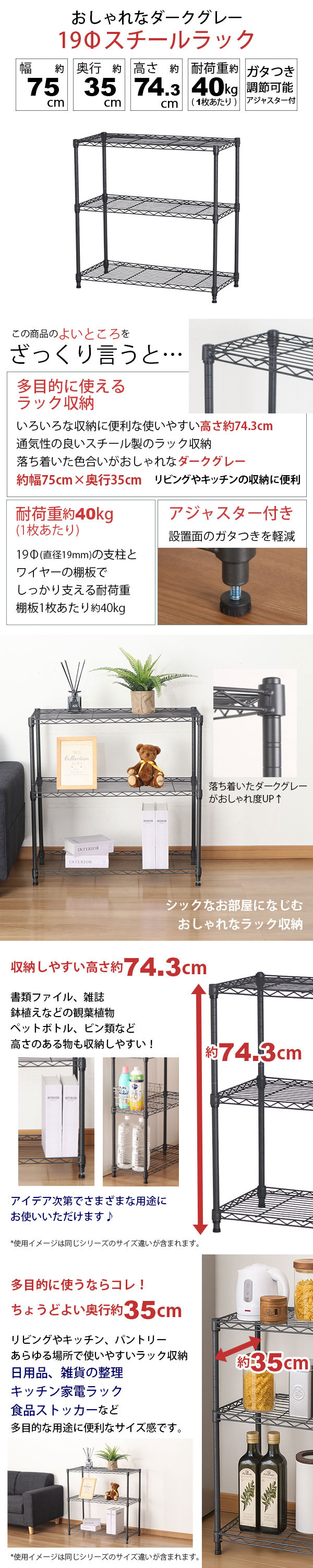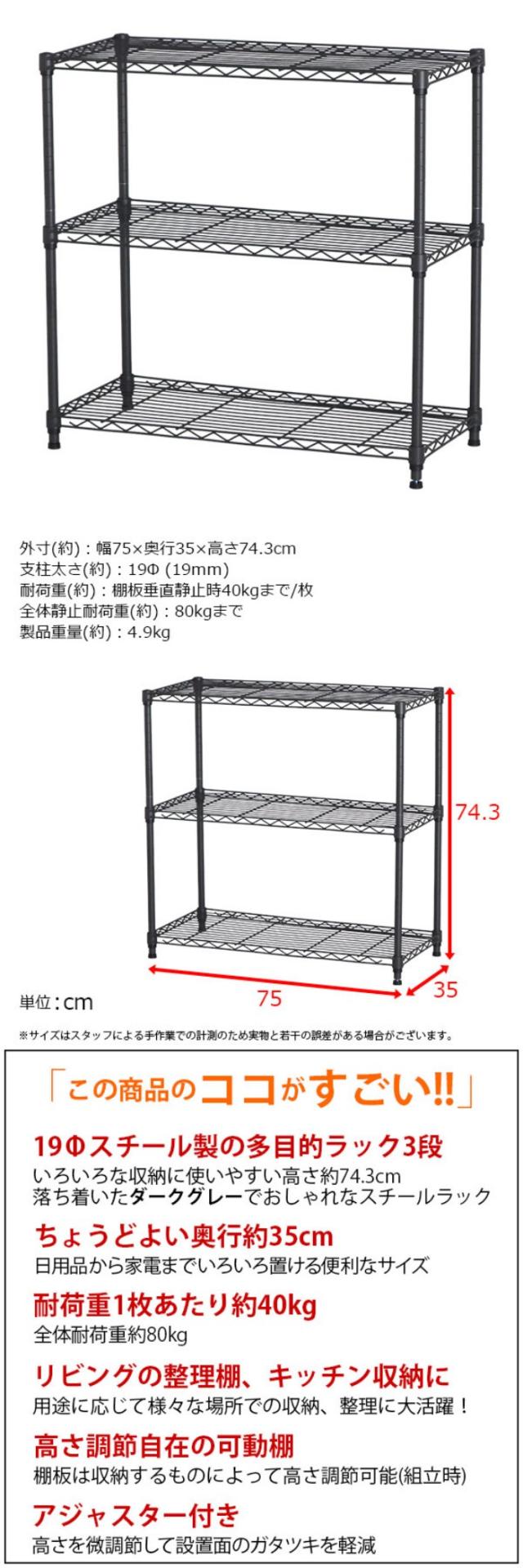 商品名:スチールラック 3段 スリム 幅75cm 奥行35cm 高さ74.3cm ダークグレー (約75×35x75cm) アジャスター付き おしゃれ くすみカラー メタル製ラック シェルフ 省スペース キッチンラック 隙間収納 頑丈 スリムラック ベッドサイドラック ソファ横 コンパクト 単品 AAS-7301 小さい オープンラック 高さを変えられる棚 丈夫 浅型 家具 インテリア 収納家具 棚 ラック 小型 三段ラック 低い 収納棚 低め スチールラック ロータイプ ローラック 高さ調整 マルチラック フリーラック 多目的ラック 整理棚 オープン棚 オープンシェルフ キッチン収納棚 レンジラック 家電収納 調理家電 キッチンストッカー 玄関ラック 玄関収納 ランドリーラック 本棚 ゲーム機 ディスプレイラック 飾り棚 コレクションラック 小物収納 おもちゃ 雑貨 ランドセルラック フラワースタンド 花台 プランターラック ベッドサイド ソファサイド デスク横 デスクサイド シンプル インダストリアル風 新生活 一人暮らし ワンルーム キッチン 台所 リビング ダイニング 玄関 オフィス 店舗 子供部屋 洗面所 脱衣所 クローゼット 押し入れ パントリー 納戸 すっきり 片付け 可動棚 アジャスター付き ポール径19mm 見せる収納 モノトーン