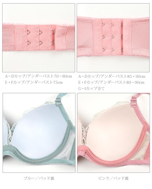 ・ホック:2段3列【A〜Dカップ(アンダーバスト70〜80cm)/ E・Fカップ(アンダーバスト75cm) 】 ・ホック:3段3列【A〜Dカップ(アンダーバスト85・90cm)/ E・Fカップ(アンダーバスト80〜90cm)/ G〜Iカップ全て 】・3/4カップ・ワイヤー入り・肩ストラップ調節可・肩ストラップ取外可・パット内蔵・パットポケットなし