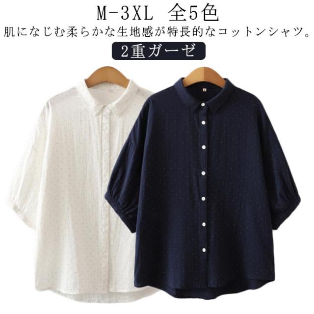 吸湿 シャツブラウス レディース 綿 夏 スタンドカラー ガーゼ ロングシャツ ドット柄 長袖 通気性 ブラウス 2重ガーゼ シャツ チュニック トップス 立ち襟 Vネック 半袖シャツ 白シャツ 上品