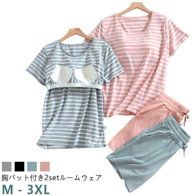 締め付けない 夏 コットン 綿 ルームウェア 半袖 ボーダー カップ付き レディース ブラ付き 半袖Tシャツ ショートパンツ 上下セット パジャマ セットアップ カップ付きTシャツ 2点セット 部屋着