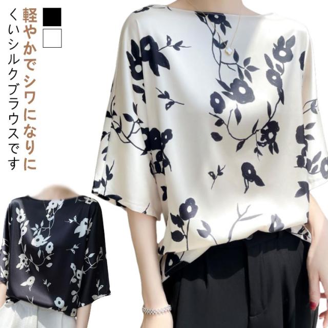卒園式 きれいめ シルク 大人 インナー レディース トップス 夏 薄手 サテン 丸首 シャツブラウス 半袖 体型カバー プルオーバー ブラウス 大きいサイズ 柄 クルーネック 光沢感 透けない 花柄