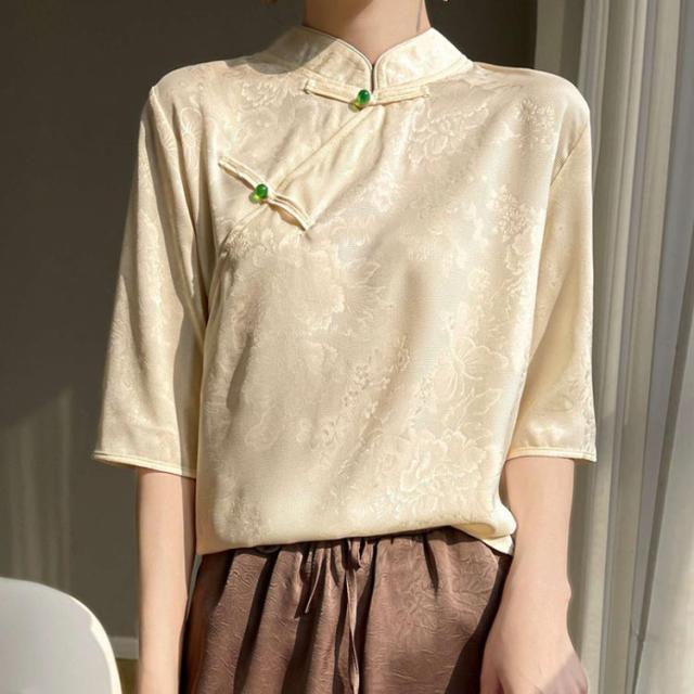 シルク スタンドカラー シャツ 半袖 チャイナボタン 夏 丸首 刺? 体型カバー 立ち襟 サテン シャツブラウス トップス 光沢感 ブラウス インナー 薄手 吸湿 通気性 肌着 大人 きれい tシャツ