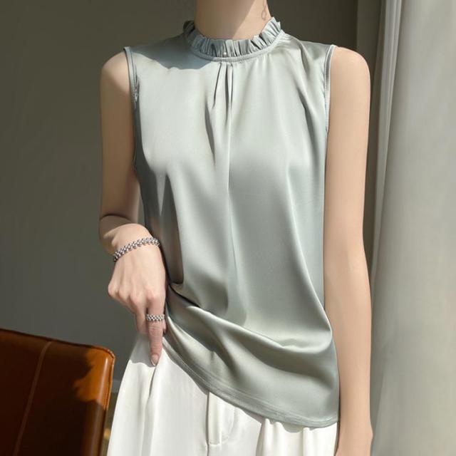 サテン フリル シルク タンクトップ 大人 高級感 立ち襟 大きいサイズ トップス シャツブラウス 薄手 ショート丈 光沢感 レディース 上品 透けない 重ね着 肌着 柔らか 通気性 楽チン 敏感肌