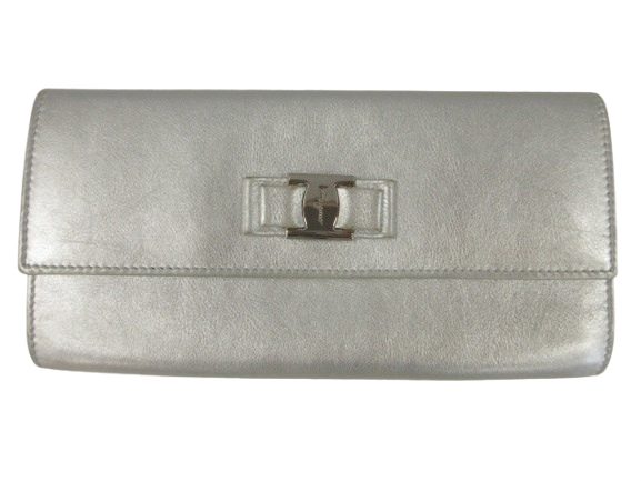【中古】サルヴァトーレフェラガモ Salvatore Ferragamo 二つ折り長財布 ヴァラリボン レザー シルバー ウォレット