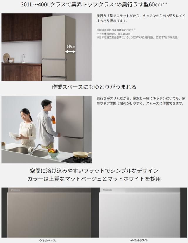 配送時間指定不可 panaco0306 NRC37ES2 標準配送設置無料 幅60cm うす型 シンプルデザイン 大容量野菜室 マットベージュ 2人暮らし