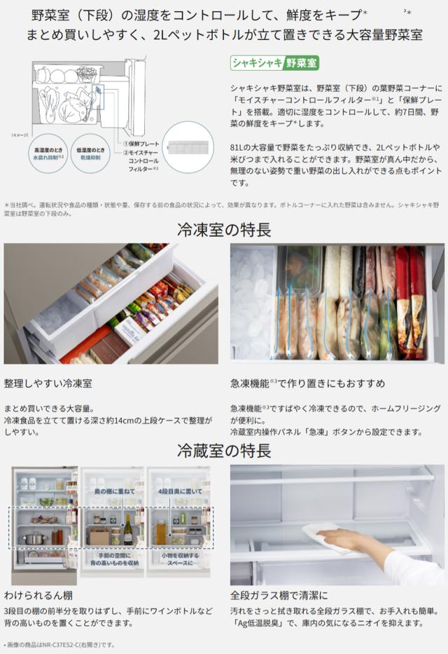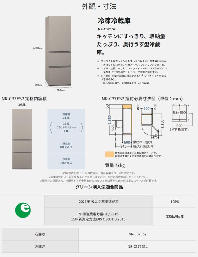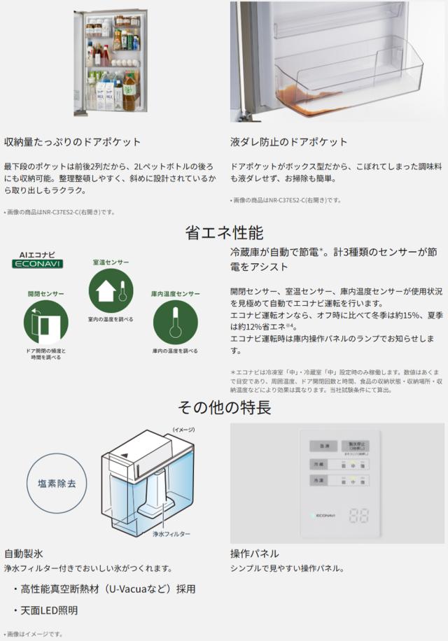 | 冷蔵庫 右開き3ドア 365L ESタイプ NR-C37ES2 C Aエリア限定配送 標準配送設置無料 スペック情報 | |