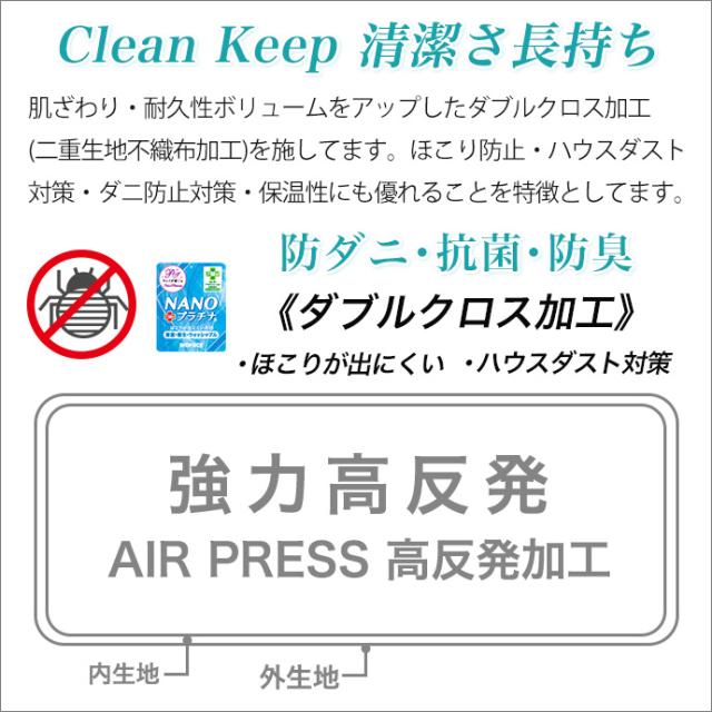 ◆お布団の下に敷いても快適な寝心地を体感 ◆床や畳にそのまま敷いても安定性 【Clean Keep 清潔さ長持ち】 ダブルクロス加工を施し、ほこり防止・ハウスダスト対策しております。また内生地には防ダニ加工、外生地には抗菌・防臭・防カビ加工をし安心で清潔な【衛生加工】を施してます。 ※素材の特性上、畳み方・運搬状態によって折り目や凹凸が残る場合も御座います。※商品到着後にすぐに開封し数時間敷いて慣らして、ベッドパット・敷きパッドを装着しご使用する事をおすすめ致します。※折り目、凹凸はご使用には問題有りませんが気になる方はウレタンをお勧め致します。ご了承願います。 日本国内工場にて一枚一枚手作りして発送しております。こちらの商品は生地巾により縫い合わせ・ハギが入ります。予めご了承願います。 |