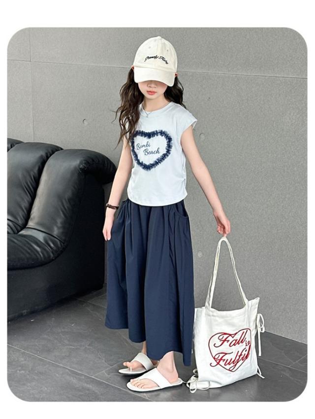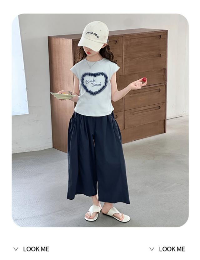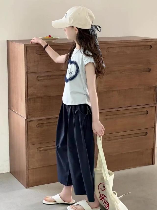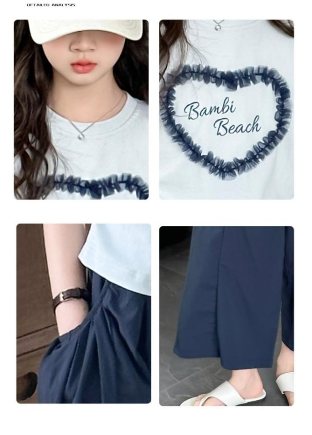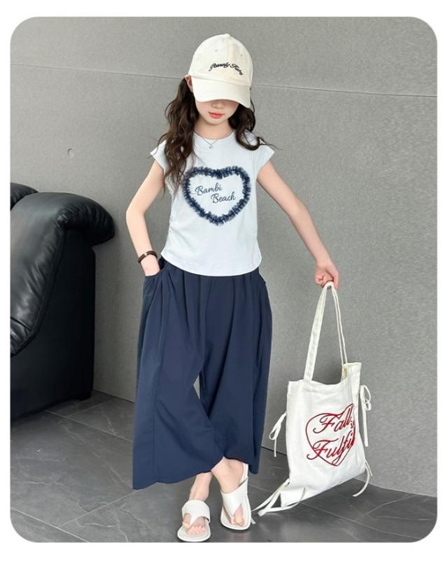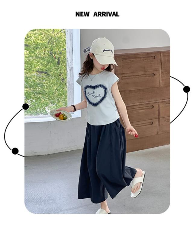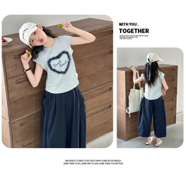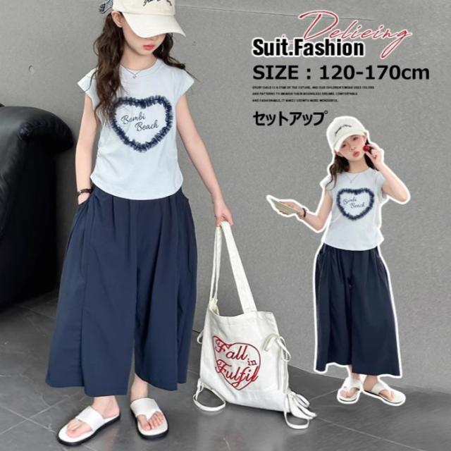 セットアップ キッズ 子供服 女の子 上下セット 綿 セットアップ 半袖 レース トップス ガウチョパンツ ワイドパンツ キッズ服 可愛い おしゃれ ハート 夏コーデ 涼しい 2点セット 170 160 150 140 130 120