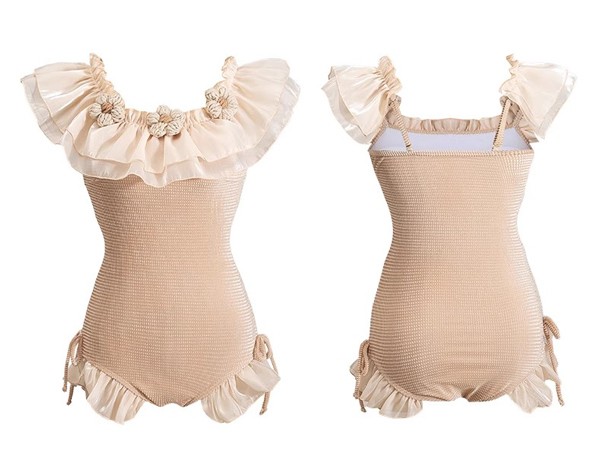 ワンピース水着 レディース エンジェルスリーブ レース 花飾り リボン かわいい セクシー フリル 水着 肩出し 着痩せ 水着 学生 小柄 コスプレ 衣装 撮影 写真用 映える 温泉 プール ビーチ ベージュ M L XL df810m4m4ld