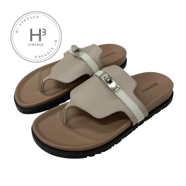 エルメス HERMES アンピール サンダル 靴 シューズ レザー ブラウン ホワイト 未使用 ケリー金具 ミュール フラット トング 送料無料