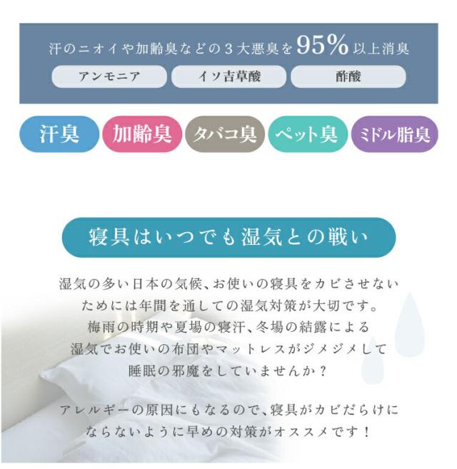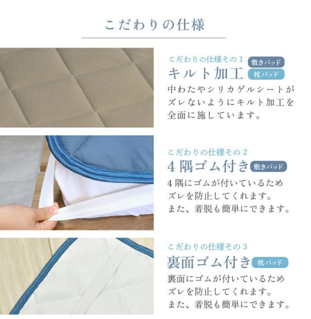 敷きパッドと枕パッドの中綿にはシリカゲルシートを入れているため、除湿消臭機能も抜群です。