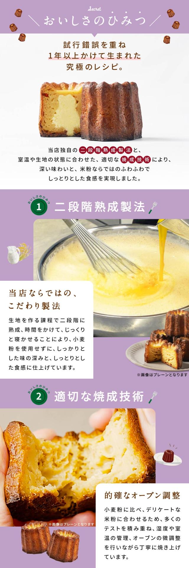 | 商品説明 | 北海道二段階熟成カヌレに『米粉のカヌレ』が登場! 小麦粉を使わないグルテンフリー食品ながら『米粉のカヌレ』は「二段階熟成技術」により、カヌレ本来のおいしさを実現しています。 小麦アレルギーのお子様も安心しておいしく食べられる新しいスイーツです。 小麦粉不使用・ラム酒不使用、保存料等の添加物等も使用しておりません。 甘味には「てんさい糖」を使用して、やさしい甘みに仕上げました。 そして、北海道産のさつまいも「紅はるか」を使用しています。 パティシエがこだわり抜いた『米粉のカヌレ』、是非一度お試しください。 |