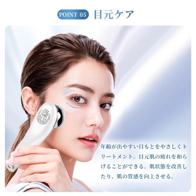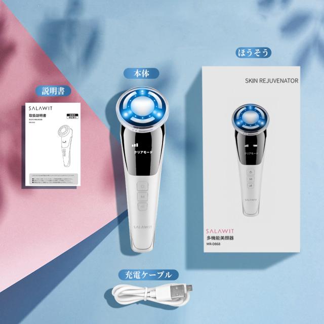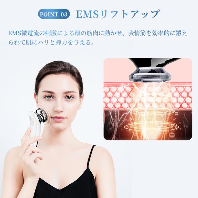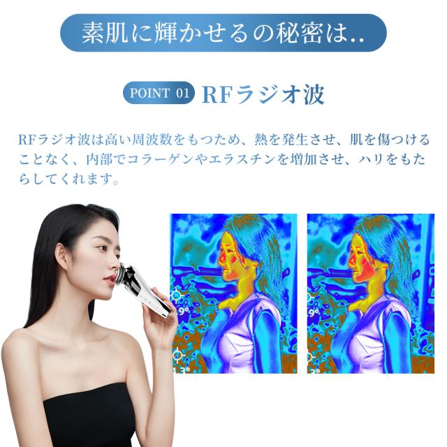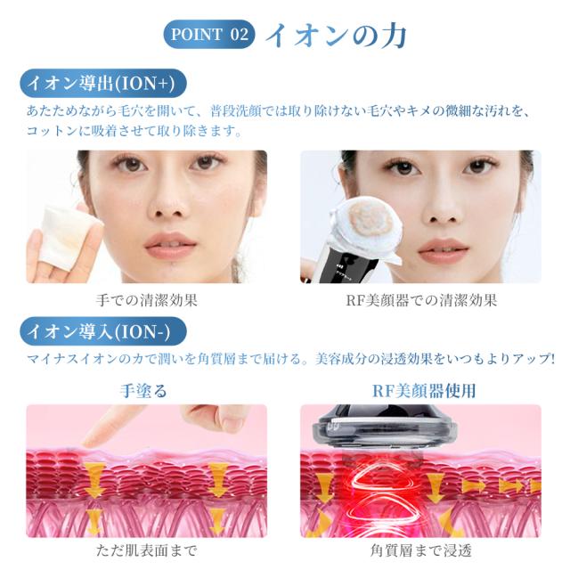 肌悩みを改善し,より透明感のあるしっとりした肌へ導き、振動で毛穴汚れをスッキリと吸着して除去し、イオンの力で化粧水やシートマスクなどの美容成分を角質層まで浸透させ、肌にハリ感を与える。