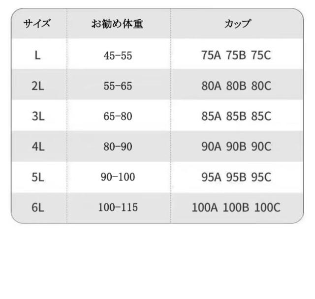 | サイズについての説明 | L:おすすめ体重45-55kg 2L:おすすめ体重55-65kg 3L:おすすめ体重65-80kg 4L:おすすめ体重80-90kg 5L:おすすめ体重90-100kg 6L:おすすめ体重100-115kg ※サイズ表の実寸法は商品によって1-3cm程度の誤差がある場合がございます。 |