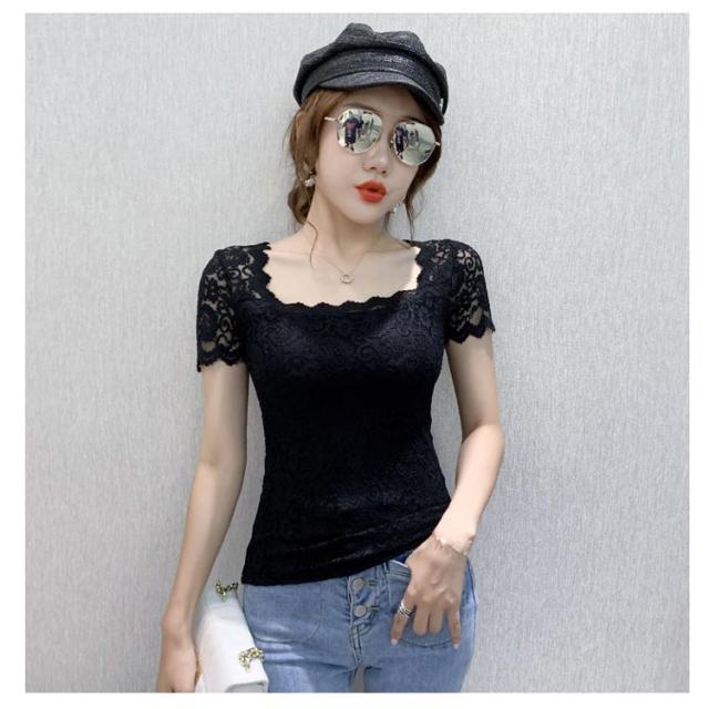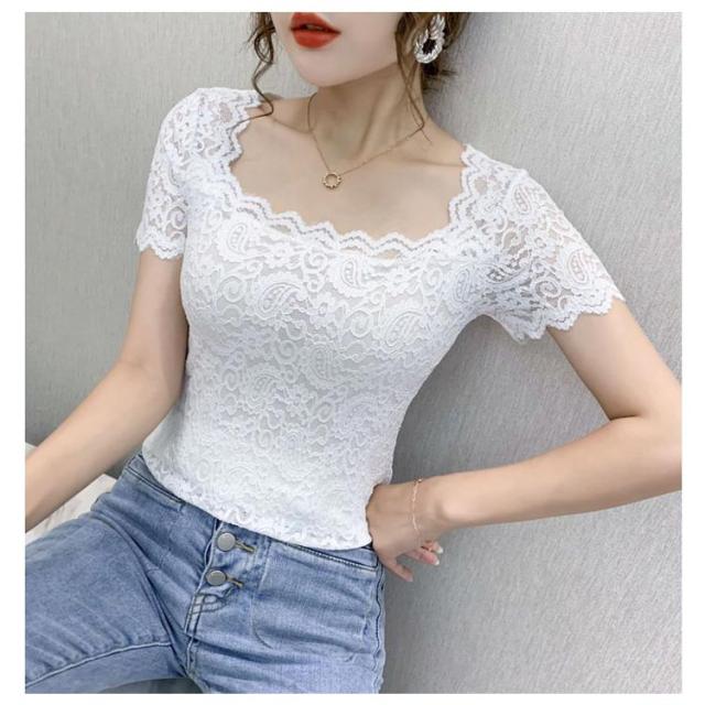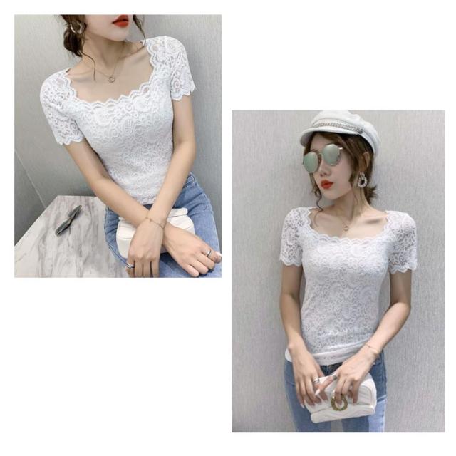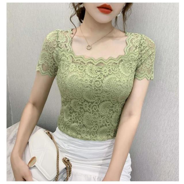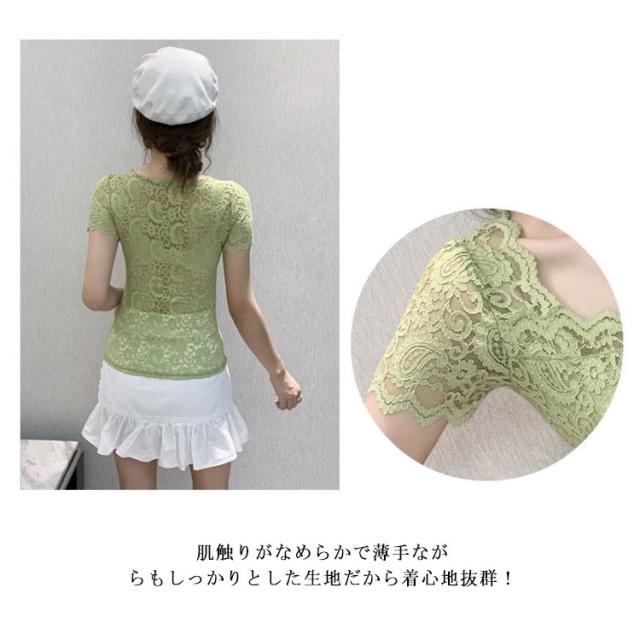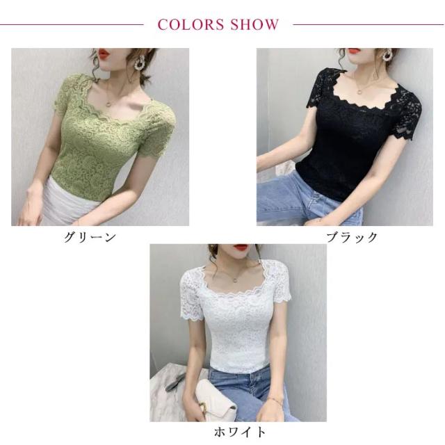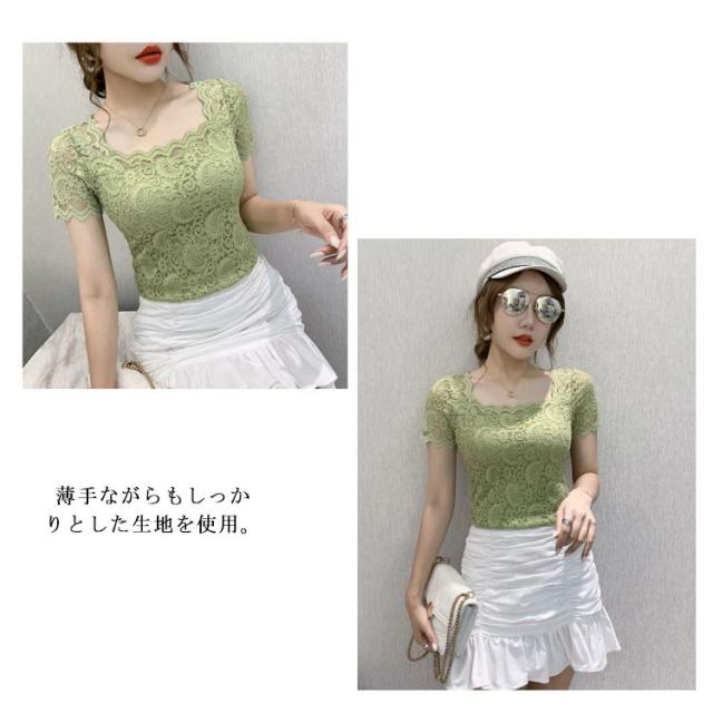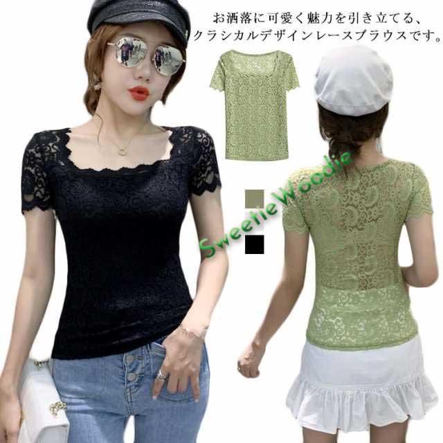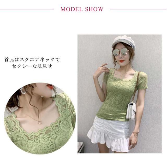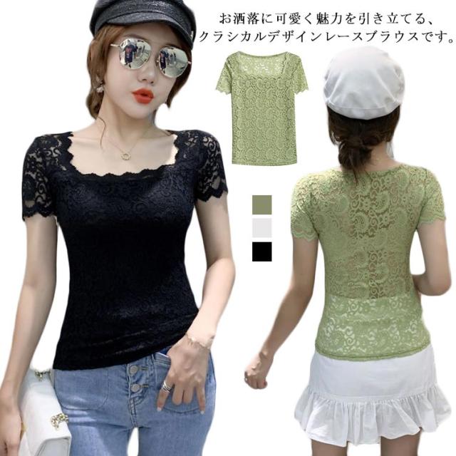 レディース トップス スクエアネック 半袖 レース 花柄 トップス 総レース 裏地付き カットソー 刺繍 トップス スリム インナー フェミニン ブラウス 花柄 刺繍 春夏