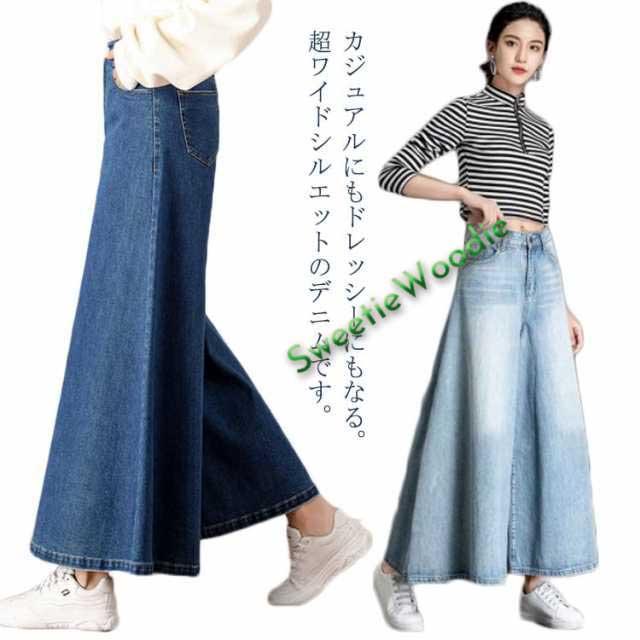 細見え ロング ワイド ワイドパンツ レディース 秋冬 オールシーズン 色落ち加工 フレア ボトムス 高見え 春 秋 デニム きれいめ 着痩せ効果 ハイウエスト 送料無料 デニム 大人 ロング カジュアル 股上深 体形カバー パンツ
