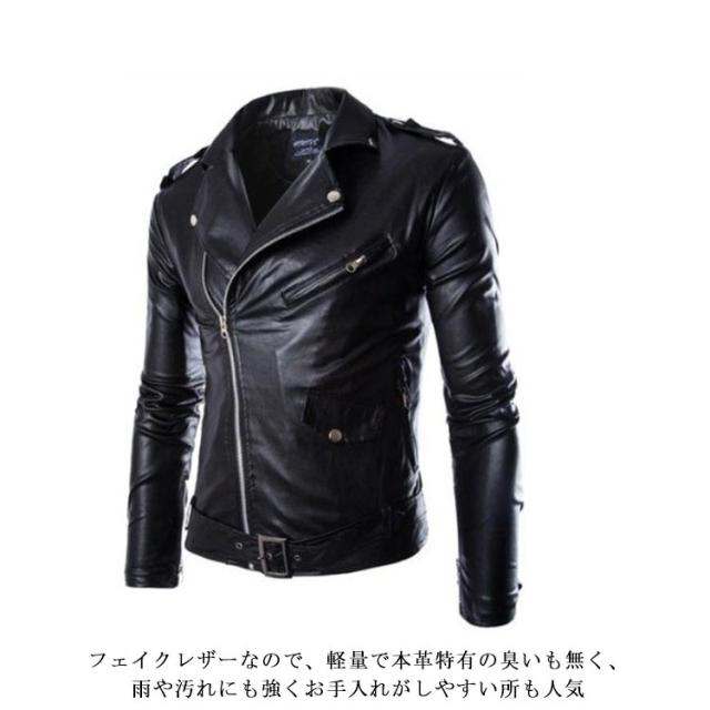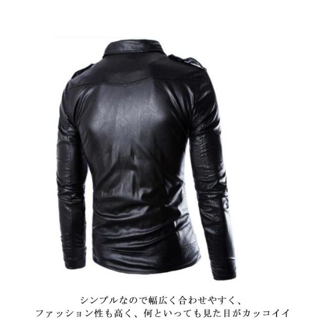 | 本革に負けない上質感があり、しなやかな質感のフェイクスレザージャケットです 柔らかな肌触りで、色彩に深みがある風合いが魅力的 フェイクレザーなので、軽量で本革特有の臭いも無く、雨や汚れにも強くお手入れがしやすい所も人気 デザイン的にタイトめにジャストサイズで着用する方がカッコ良くおすすめ シンプルなので幅広く合わせやすく、ファッション性も高く、何といっても見た目がカッコイイ | |