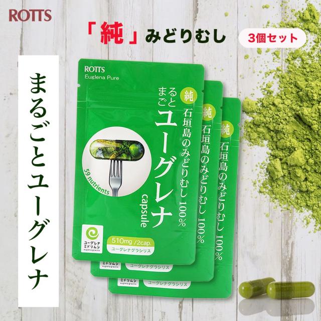 3個セット ユーグレナ 認証 みどりむし 100% 高配合 サプリ まるごとユーグレナ 合計90カプセル 純 石垣島 ミドリムシ 1粒に510mgの ユーグレナ粉末 配合 サプリメント パラミロン ダイエット ROTTS ロッツ メーカー公式