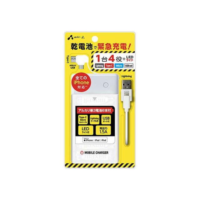乾電池で緊急充電!。1台4役+LEDライト。[Lightning] [Type-C] [microUSB] [USB out]。?緊急時や災害時に便利な6本タイプのスマホ用充電器です。高出力1.5Aで、弊社1Aタイプに比べ約2倍のスピード充電を実現。※1時間30分の充電でiPhoneSE(第2世代)を約70%〜iPhone15を約33%充電。収納式マルチコネクターケーブル(microUSB+Type-C) 搭載により、これ 1台で様々なスマートフォン充電に対応。Lightningケーブル付属でiPhone5以降に対応。停電などの緊急時に大変便利なLEDライト搭載。?■ アルカリ単3電池6本付。■ Type-C・microUSB マルチケーブル。■ Lightningケーブル付。■ USBポート付。■ LEDライト付。■ 高出力1.5A。