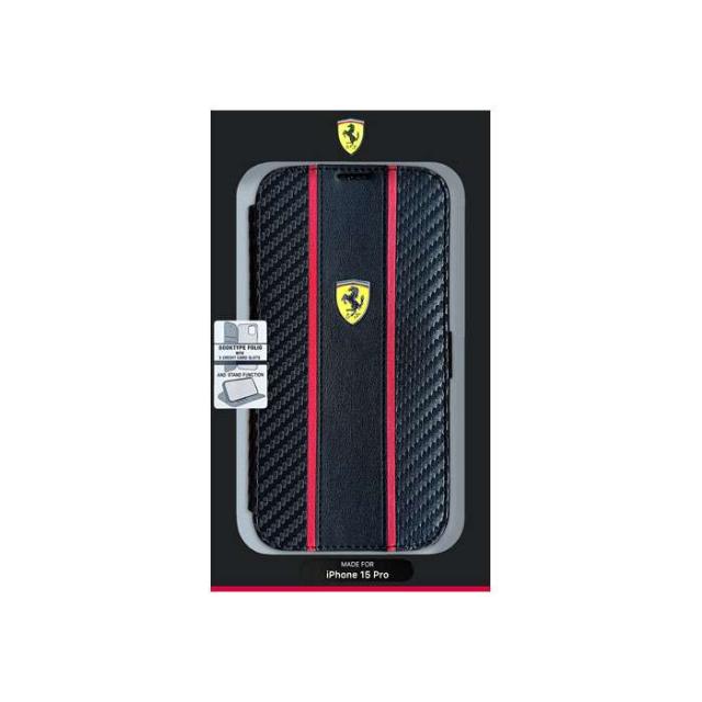 フェラーリ iPhone15 Pro用 PUカーボン 手帳型ケース。