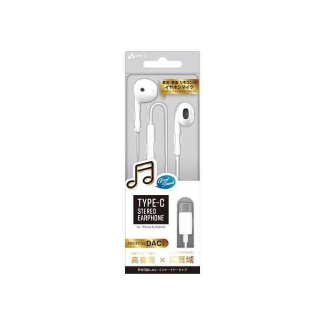 マイク付き ステレオイヤホン?。TYPE-C?STEREO EARPHONE for iPhone & Android。DACアナログ変換で ダイナミックドライバー。 高音質 ? ?× ? ?広音域 ?。??。■写真撮影もワンタッチ 自撮りもラクラク(iPhoneのみ)。■マイク内蔵 ハンズフリー通話対応。■音声コントロールもらくらく起動(iPhoneのみ)。■選曲リモコンで音楽や動画の視聴もラクラク。■耳への負担が少ないインナーイヤータイプ。