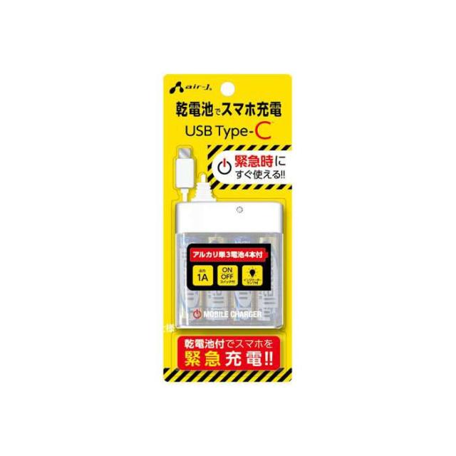 USB TYPE-Cケーブル付 乾電池式緊急充電器 エアージェイ BJ-ECUSB1A WH