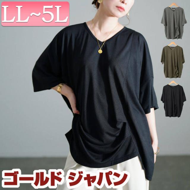 春新作 大きいサイズ レディース トップス カットソー Tシャツ アシメタックプルオーバー ドルマントップス ドルマン 半袖 5分袖 Vネック アシメ 変形 タック ドレープ ストレッチ 無地 ゆったり 夏服 秋服 春服 LL 2L 3L 4L 5L ブラック 黒 カーキ グレー ゴ イベントセール