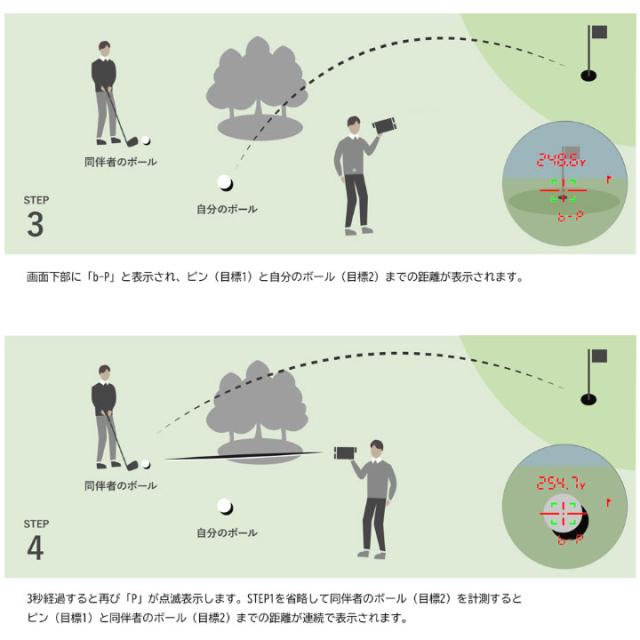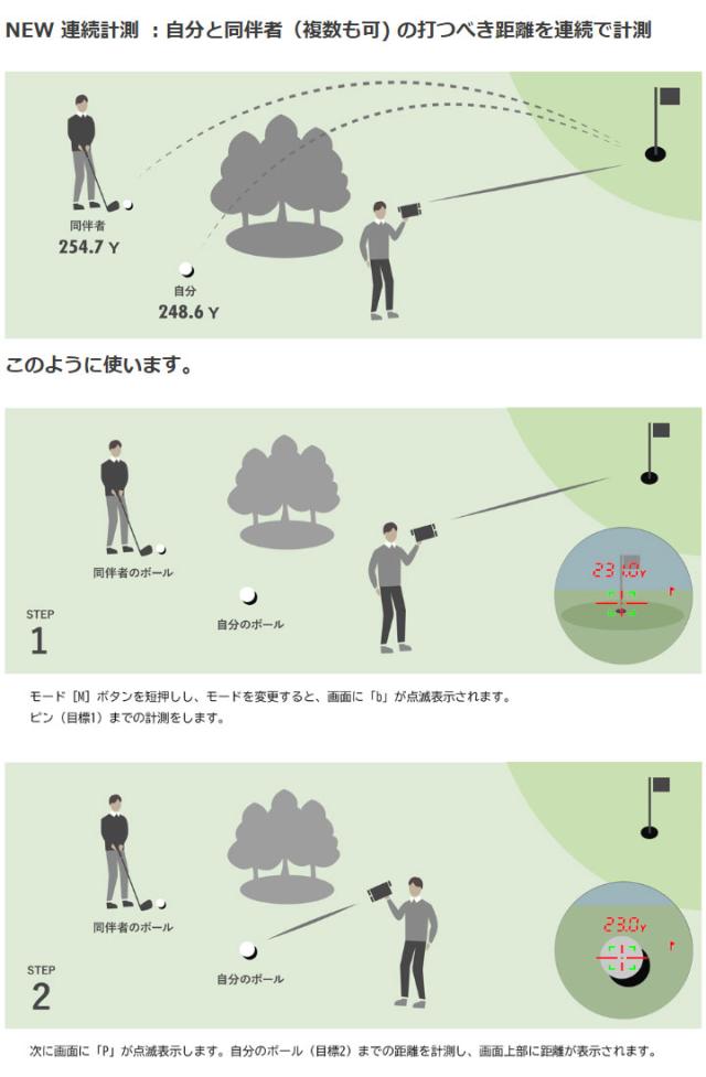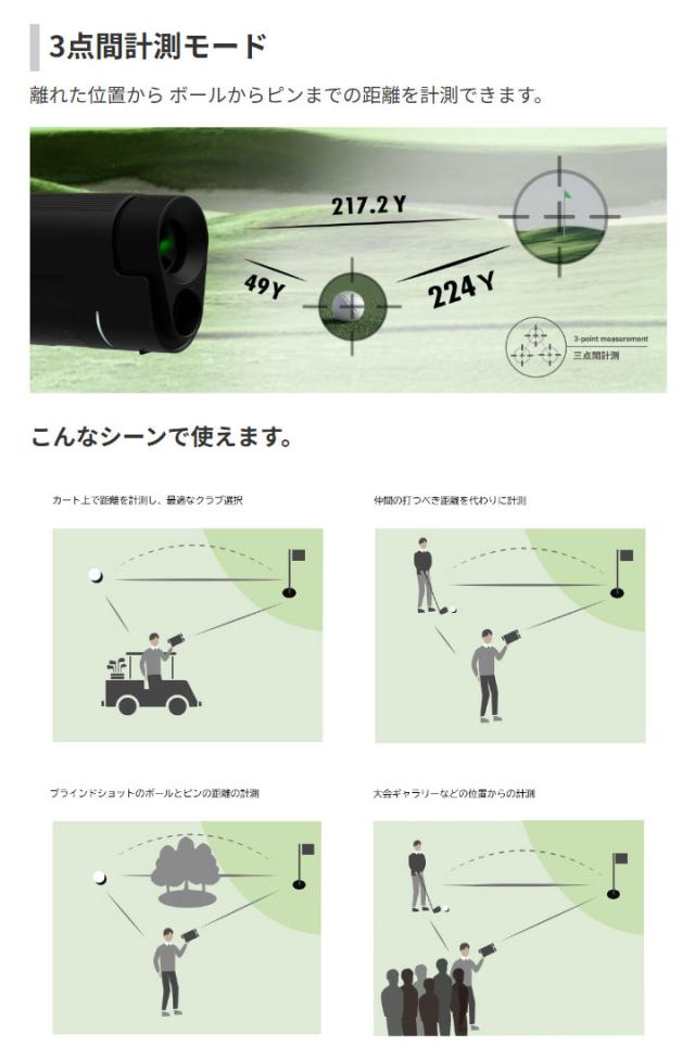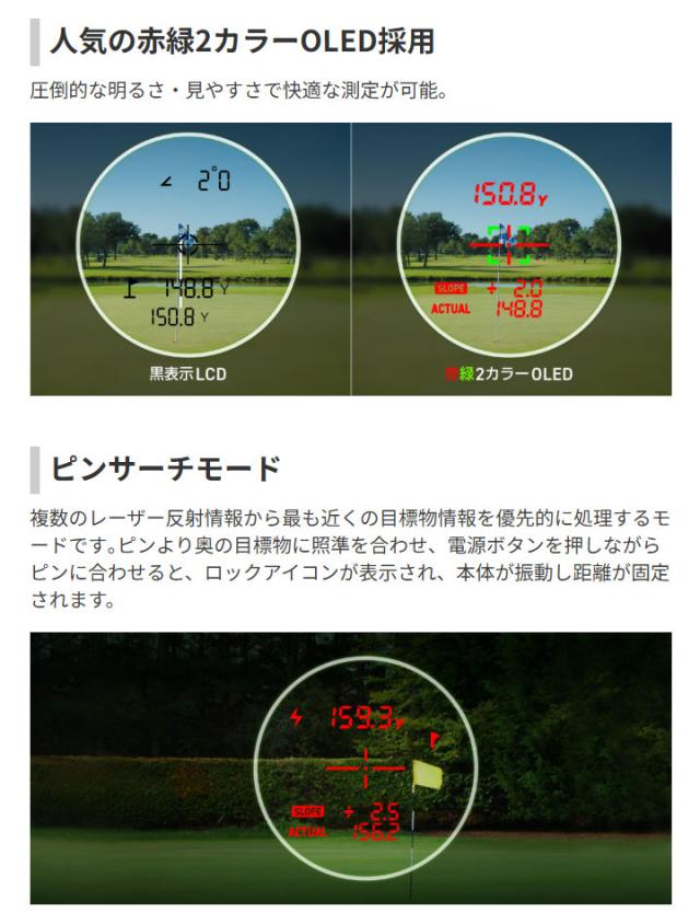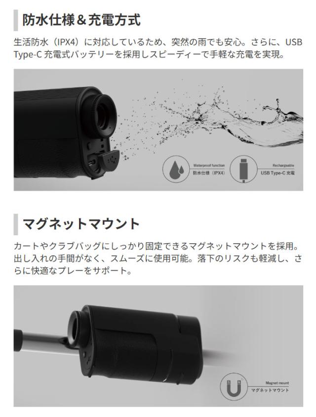 赤と緑の2色OLEDディスプレイを搭載し、視認性とデザイン性を両立。ピンサーチ、スキャンモード、3点間計測に加え、気象情報を加味したハイブリッド計測機能採用。マグネットマウントにより、カートやバッグへの装着もスムーズで、快適な操作性を実現しました。