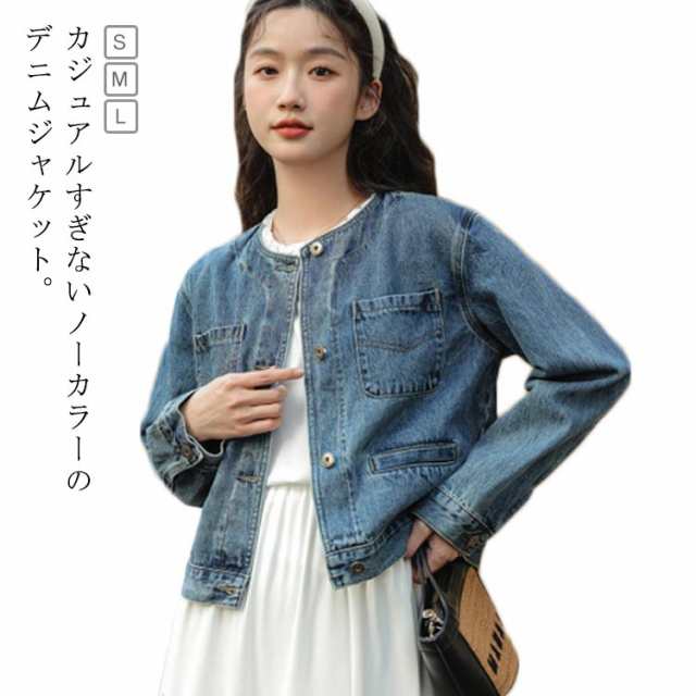 ノーカラージャケット デニム ジャケット レディース ノーカラー デニムジャケット ショート丈 デニム ブルゾン アウター ジージャン Gジャン 羽織り 秋ジャケット 秋アウター 韓国 大人 カジュアル 大人可愛い きれいめ ブルー 【送無】